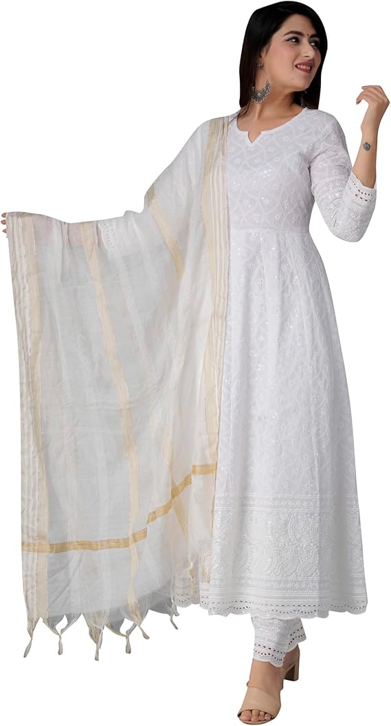 JG JAI GOVINDAM Women Chikankari Cotton Kurti With Pant & Dupatta Set Suit – Dress Set