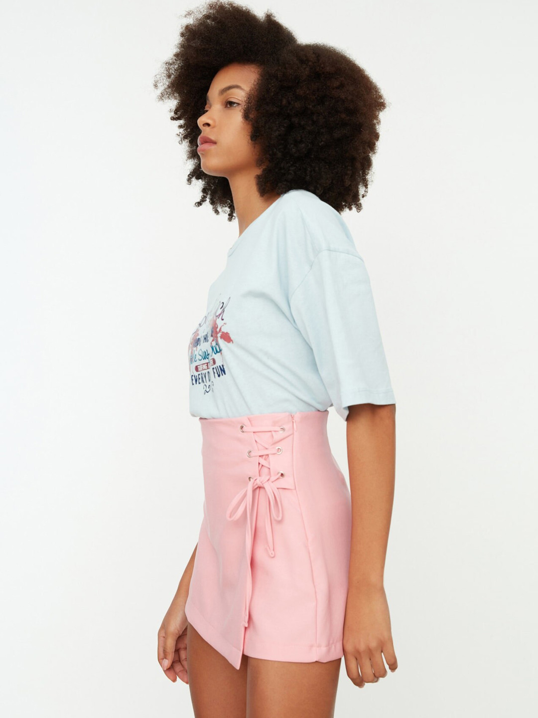Pink solid front overlap panel mini skort skirt, slip on closure, tie up, asymmetric hem